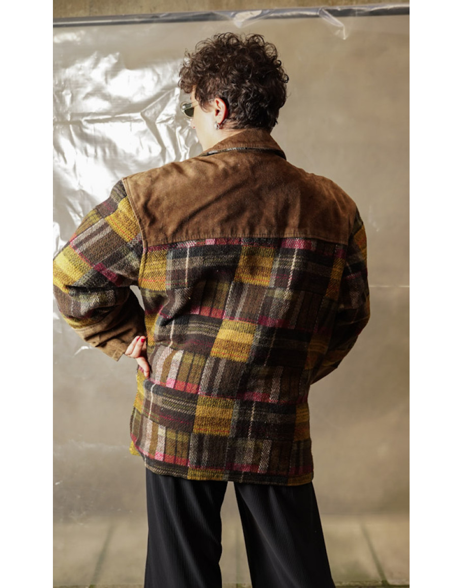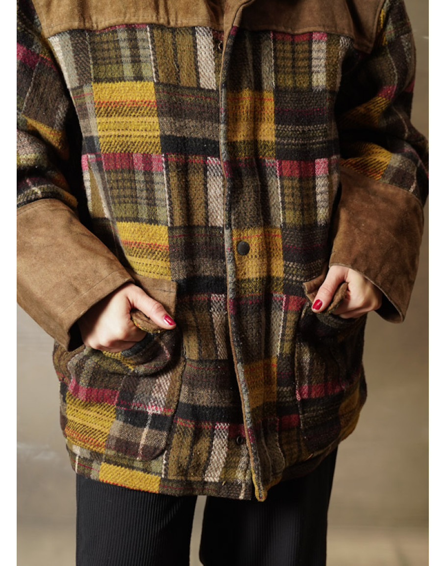Vintage unisex μάλλινο καρό jacket με suede λεπτομέρεις M